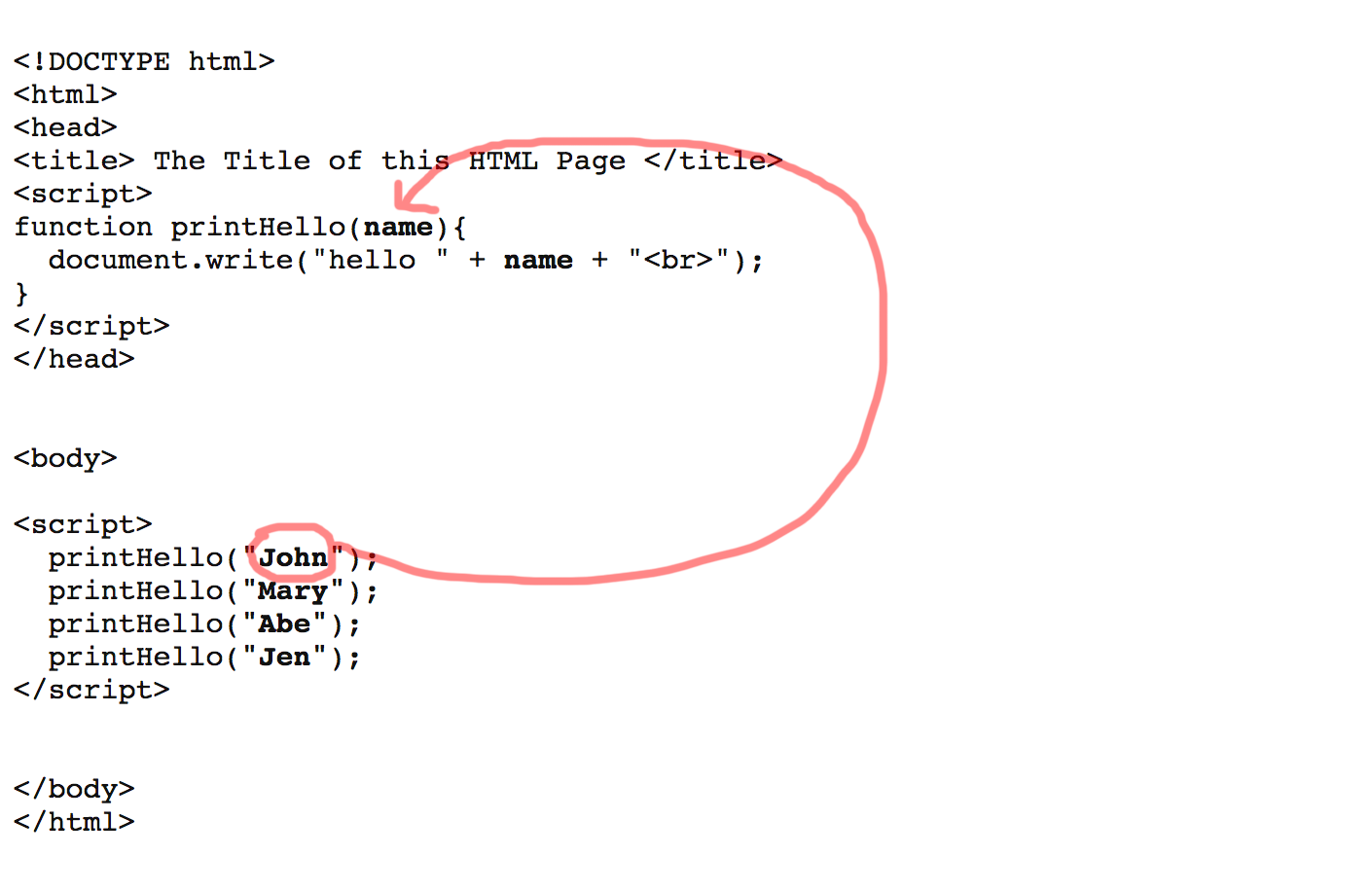 Example with the definition of a function and a example calling that function. Note that the definition is in the <head> section. This is to ensure that the definition is available when the rest of the document loads.