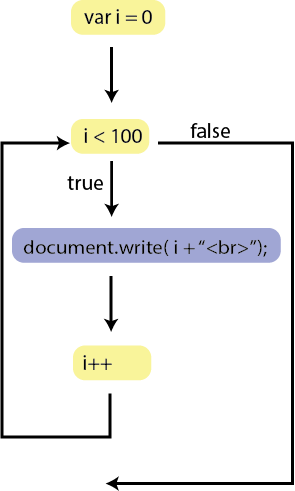 Starting with the initial condition i=0, as long as i < 100, execute statements then increment i by 1. (In plain English, iterate over the statement 100 times)for(var i=0; i<100; i++){ document.write(i + "<br>"); }