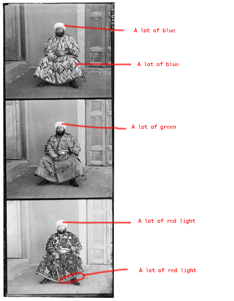 Sergey took three different black and white photographs with red, green, and blue filters... and combined them (left, original b/w photos. right: digitally composed color photos)