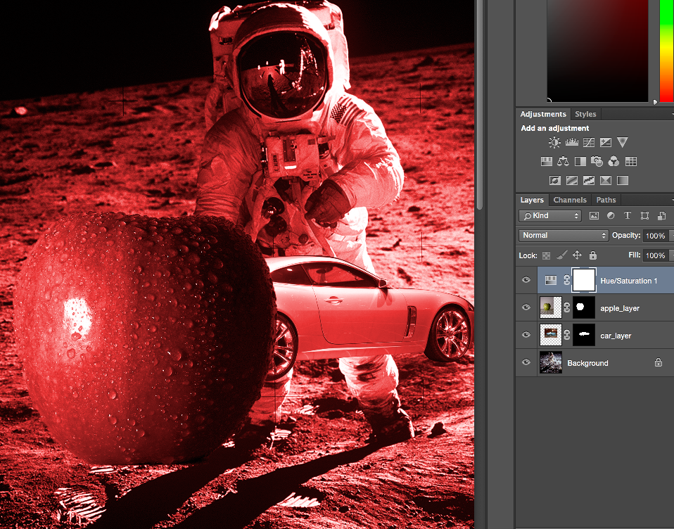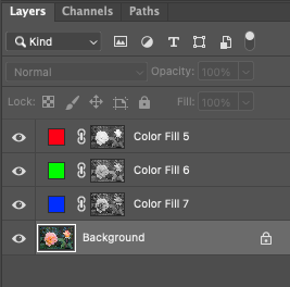 Repeat this for red, green, and blue so that you have three solid colors with the mask made from the appropriate channel