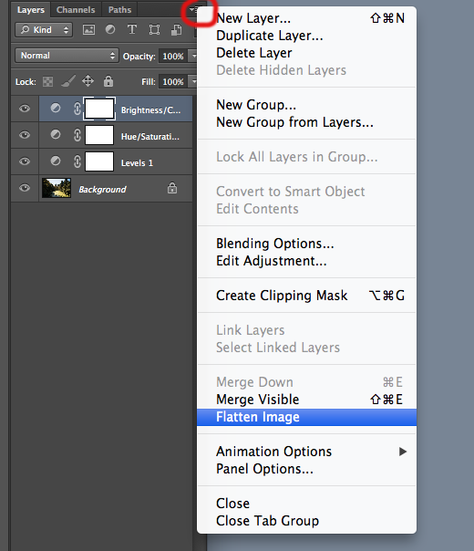 Make sure only the colored original photo is highlighted in the layers panel.